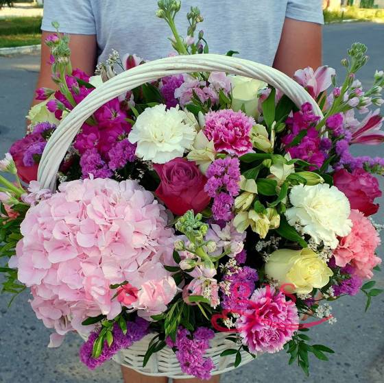 Белоснежная плетеная корзина с прекрасными цветами демонстрирует неподдельное воплощение чувств, любви, нежности». Букет состоит из различных цветов: гвоздик, темных и светлых фрезий, кермека, бутонов роз и пышного соцветия ароматной гортензии. Гармонично подобранный букет не нуждается во всевозможных декоративных элементах, он выглядит вполне продуманно и респектабельно.